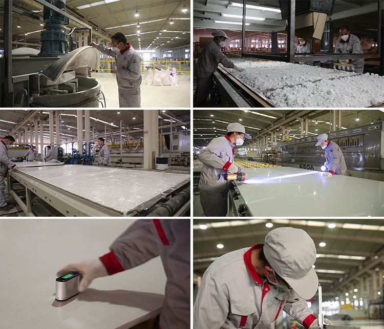 O processo de fabricação é controlado e existem medidas de controle de qualidade para placas de pedra de quartzo que não são possíveis para pedras naturais. O processo usado durante a produção garante que qualquer placa de quartzo entregue será idêntica em cor e textura à placa de amostra. Nossa equipe de controle de qualidade verificará todas as placas antes de embalar.
